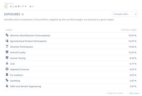 - Largest coverage: Clarity AI offers a granular classification of exposures divided in 19 high level subjects, and 50 sub-topics. Our Exposure Screens universe is composed of global stock issuers, covering more than 40,000 companies
